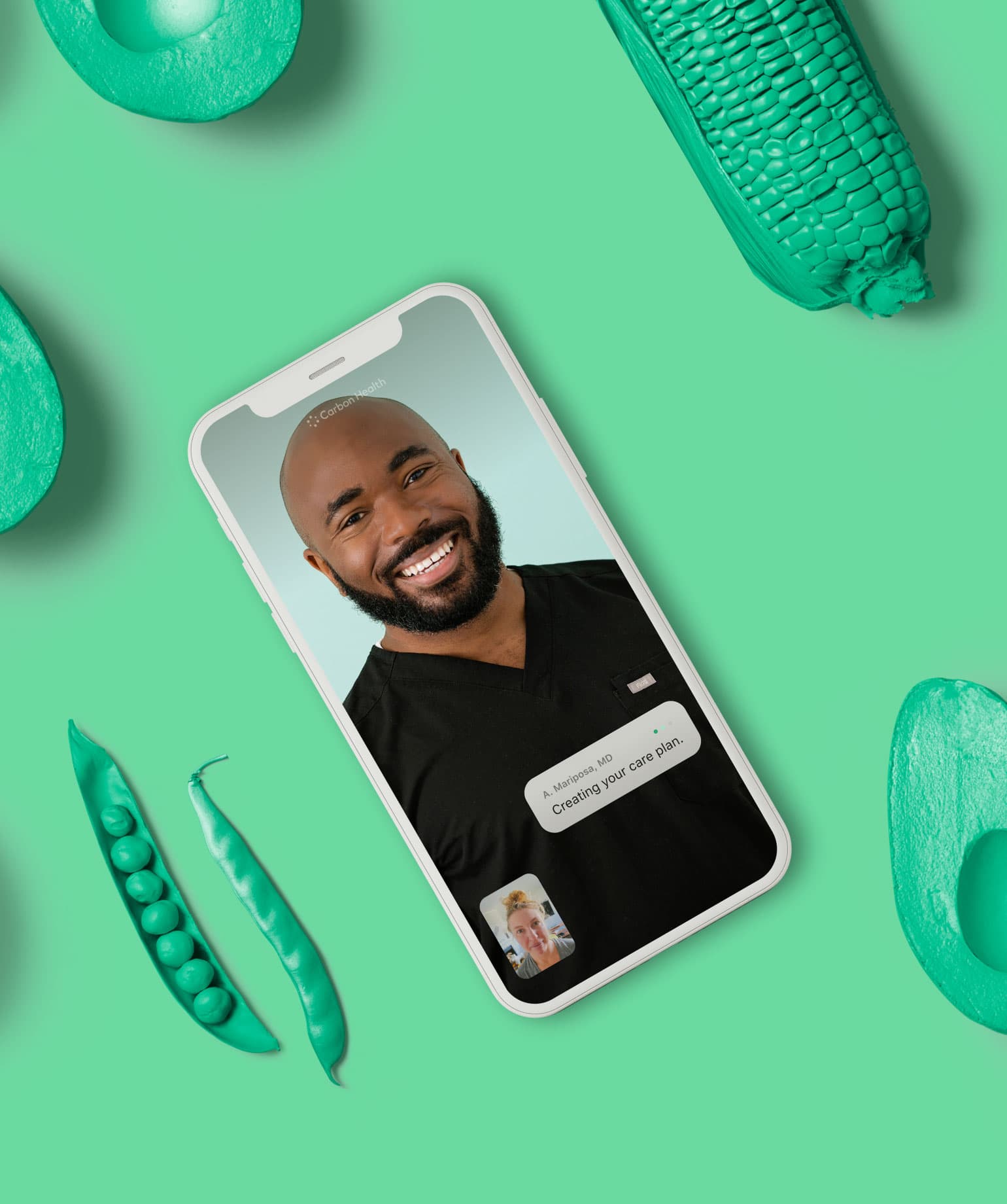 An illustration of a mobile phone during a virtual appointment with a Carbon Health provider, who is smiling.